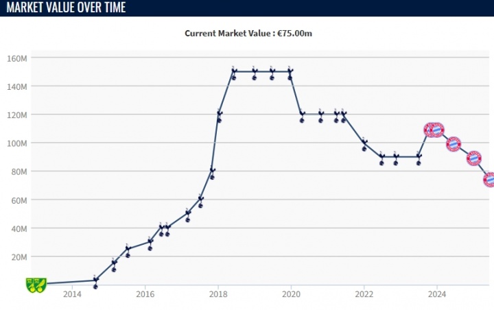 值得一提的是,凯恩本赛季开局发挥非常出色,各赛事代表拜仁出场15次,贡献21球4助攻,帮助拜仁德甲6连胜领跑积分榜。但凯恩的身价并没有因此上涨。