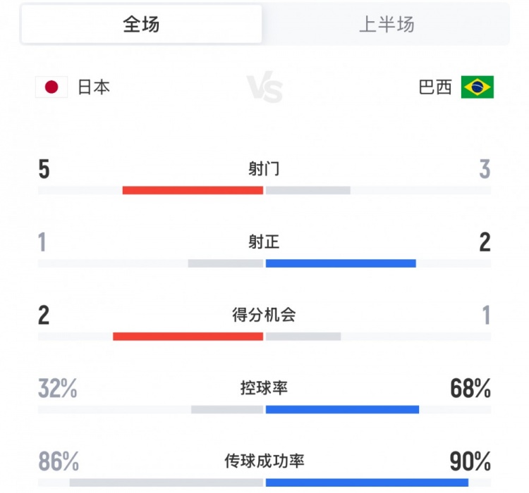 发布时间:2025年10月15日 00:05点击:栏目:足球新闻 10月14日讯 国际友谊赛,日本队主场迎战巴西队,半场结束日本队0-2落后,保罗-恩里克和马丁内利为巴西队破门,日本队方面,上田绮世错失空门机会,另外也创造了数次有威胁的进攻。日本vs巴西半场数据对比(主队日本队在前)射门数:5-3射正数:1-2得分机会:2-1控球率:32%-68%传球成功率:86%-90% 除特别注明外,本站所有内容均为24直播网整理排版,转载请注明出处:日本vs巴西半场数据:射门5-3,得分机会2-1,控球率32%-68% 本文标签: 足球 国家队 日本 巴西 五洲 J联赛